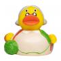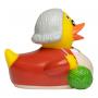 Le canard jaune couinant "Grand-mère tricoteuse" MBW® incarne une scène pleine de tendresse et d’authenticité. Avec ses cheveux gris, ses lunettes, sa robe beige, et son gilet rouge, il tricote avec une pelote de laine verte et des aiguilles assorties, évoquant le charme des grands-mères. Fabriqué en PVC, il mesure 8 x 8 x 7,5 cm pour un poids de 46 g.