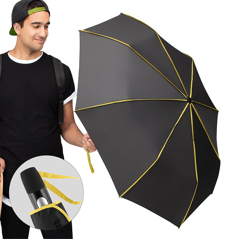 Le parapluie de poche FARE® est conçu pour une protection fiable et élégante avec sa toile en polyester pongé de 104 cm de diamètre, répartie en 8 panneaux. Sa technologie windproof et son baleinage flexible assurent une stabilité et une résistance optimales aux vents forts.