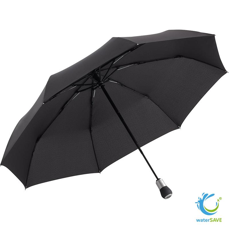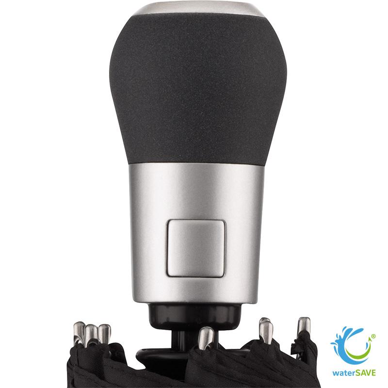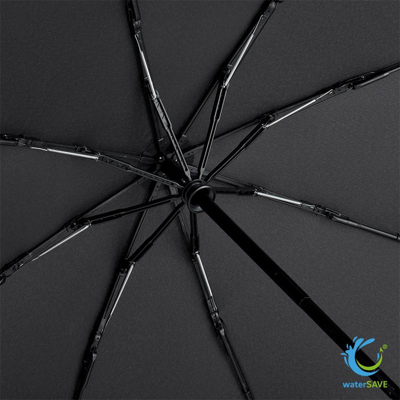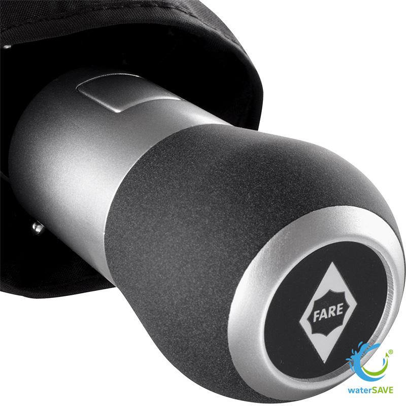 Le parapluie de poche waterSAVE FARE® associe une toile en polyester pongé recyclé à 8 panneaux et un baleinage Fibertec en 3 parties, offrant flexibilité et résistance. Son mât en acier noir et sa poignée en forme de pommeau de vitesse avec déclencheur intégré assurent une bonne prise en main.