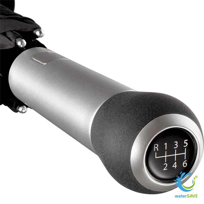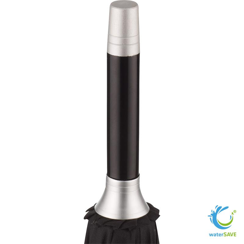 Le parapluie standard waterSAVE FARE® combine une toile en polyester pongé recyclé à 8 panneaux et un baleinage Fibertec en fibre de verre extra flexible, assurant stabilité et souplesse. Son mât en acier galvanisé de 14 mm et sa poignée droite en forme de pommeau de vitesse avec déclencheur intégré offrent une prise en main sûre et ergonomique.