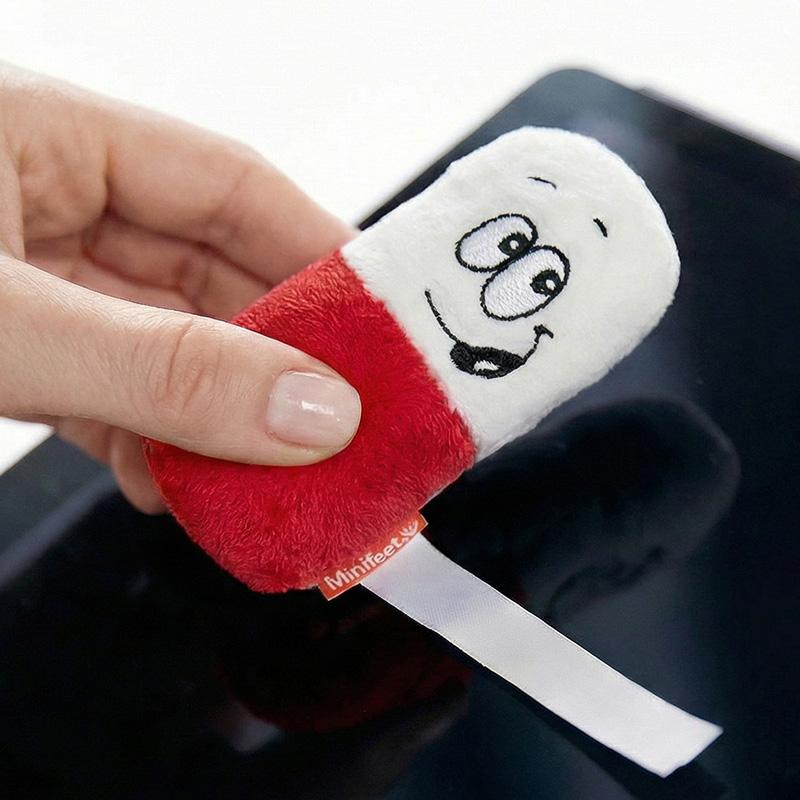 La pilule Schmoozies® en peluche douce de MBW® est un objet humoristique et fonctionnel. Disponible en rouge et blanc ou bleu et blanc, elle est parfaite pour nettoyer les écrans de téléphones et tablettes grâce à sa face inférieure en microfibre.