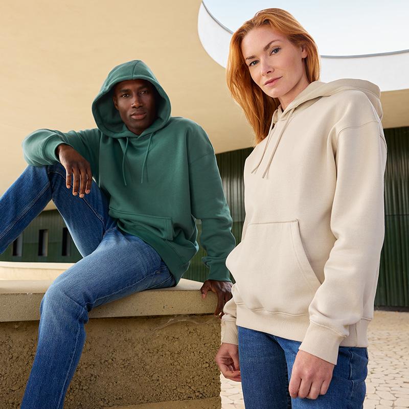 La capuche doublée avec cordon de serrage, la poche kangourou et les finitions en bord-côtes avec élasthanne assurent un maintien agréable et une bonne tenue dans le temps. La bande de propreté ton sur ton renforce la qualité perçue.