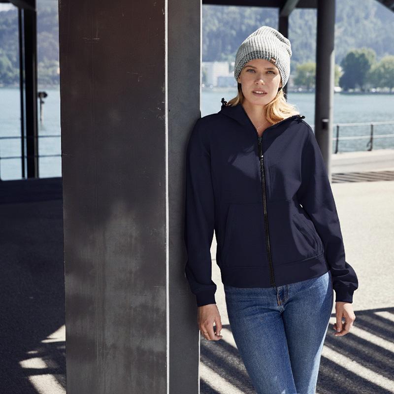 La veste softshell à capuche pour femme Daiber® allie performance et style. Conçue en tissu extérieur 94 % polyester et 6 % élasthanne (260 g/m²), elle offre une grande liberté de mouvement tout en étant résistante à l'eau et à la saleté grâce à la finition BIONIC-FINISH®ECO.